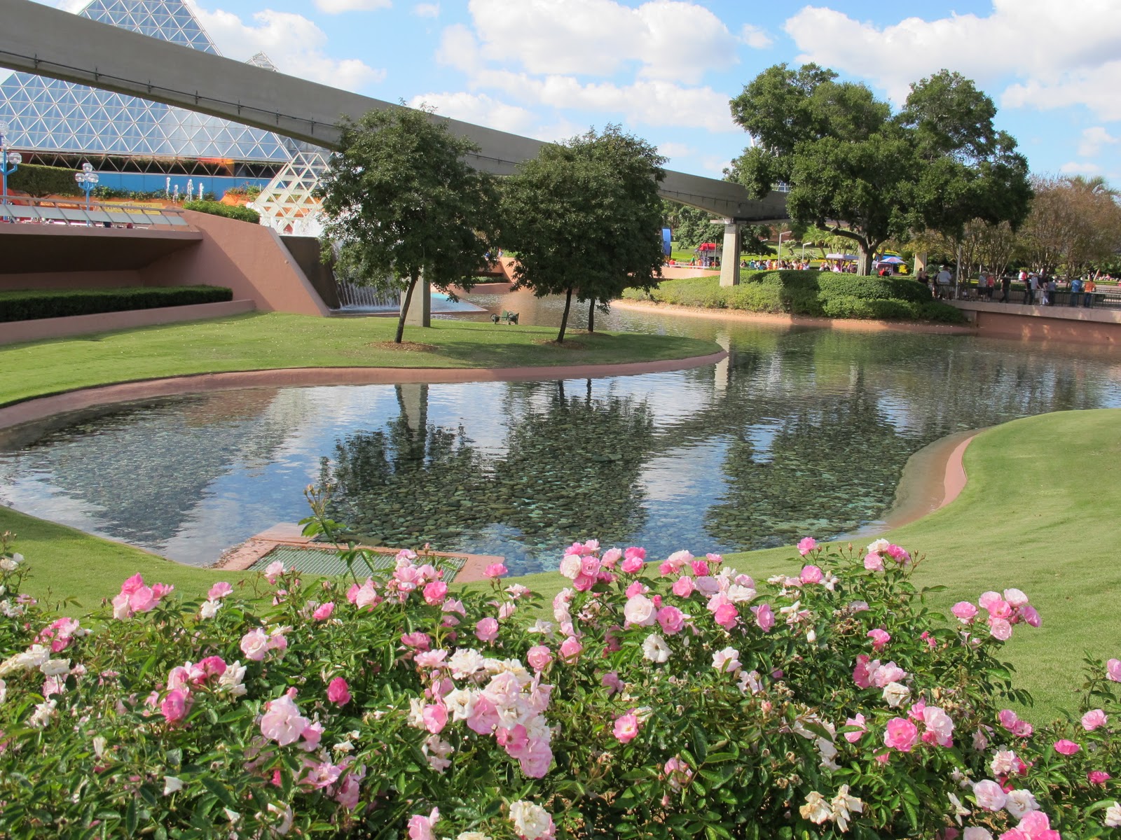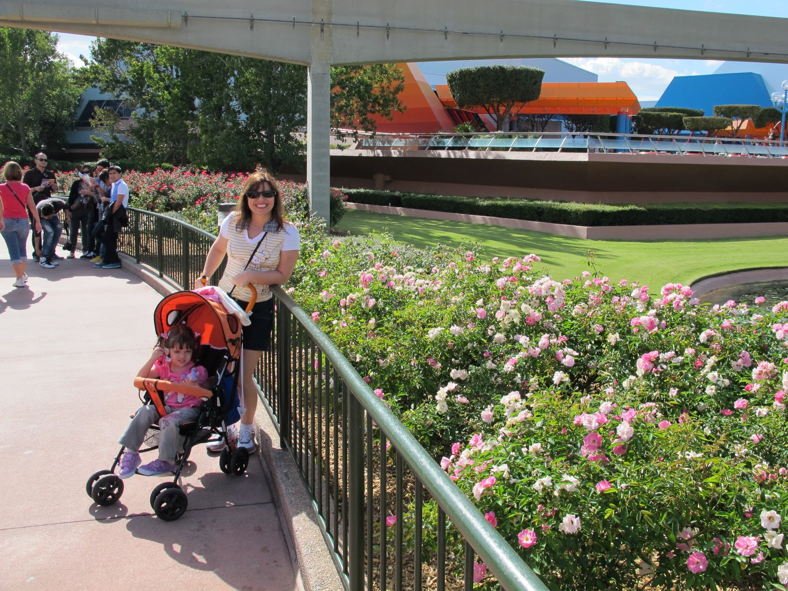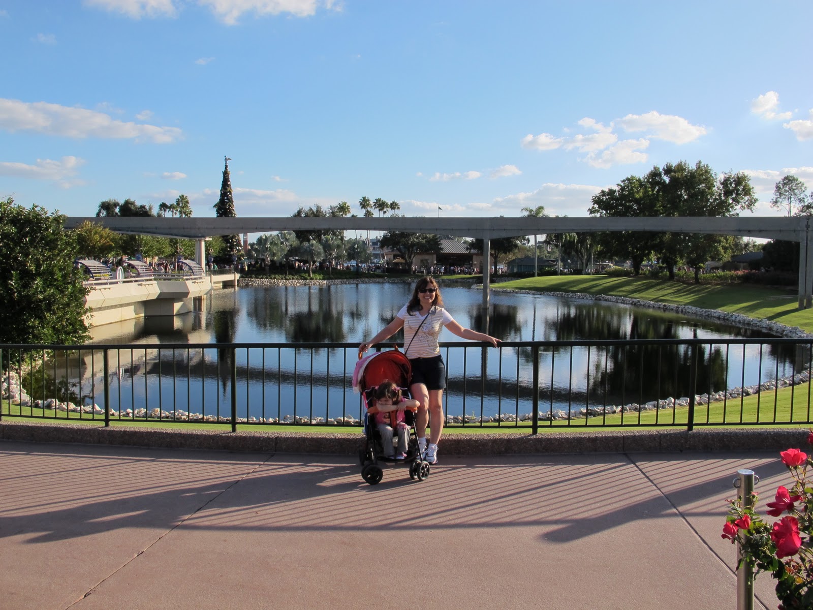 Já tínhamos feito o Future World no outro dia, e agora resolvemos só passear um pouco, e fomos apenas uma vez no Imagination, para a Ellerim ver o Figment de novo, e uma vez no Spaceship Earth, e a Ellerim conseguiu ficar bem retinha para aparecer na foto. Perto das onze seguimos para a entrada do México, mas não conseguimos chegar até nosso destino. A Ellerim parou num canteiro, e quis ficar brincando ali. Como o dia estava lindo, e o World Showcase ainda não tinha aberto, ficamos por ali mesmo. Eu e o Mauro sentamos no banquinho, e a Ellerim ficou feliz da vida correndo sem parar ao redor do canteiro. Mas depois de meia hora ali ela ainda não queria ir embora, e foi um sufoco seguir adiante.