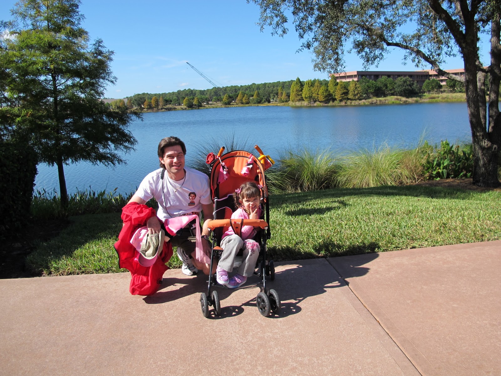 Já estava ficando um pouco tarde, mais ou menos duas horas, e resolvemos então voltar para o hotel, para tomar um banho de piscina, já que estava bem quente. Como era dia de horas mágicas, resolvemos dar uma parada no meio do dia, e voltar mais tarde. A Rô também ía para o Hotel. Quando estávamos saindo, encontramos com a Rafaela, o Paulo, a Thais e o Fabiano. Ficamos um tempão conversando em frente à árvore de natal, enquanto a Ellerim ficava correndo pra lá e pra cá. Até que uma hora ela veio correndo, e um cara sem querer deu uma baita rasteira nela. Ela voou no chão, ralou as mãos e, claro, caiu num berreiro. O cara ficou apavorado, não sabia o que fazer e ficava pedindo desculpas, mas eu fico bem calma nessas horas. Quando eu voltei com a Ellerim pra perto do pessoal o Paulo estava perguntando pro Mauro se ele queria ajuda pra encher o cara de porrada, rsrsrsrs. Bom, depois disso acabamos nos despedindo, e fomos pegar nosso ônibus para o hotel. Chegamos mais ou menos às três da tarde, e é incrível como o Pop é mais frio que os parques. Estava bem fresquinho, mas eu já tinha prometido que teria piscina, e não podia voltar atrás. Encontramos com a Rô e a Manu, trocamos de roupas e fomos para a piscina. O Mauro ficou no quarto descansando. Eu e a Ellerim fomos para a piscina infantil. Não é bem uma piscina. Todo o chão é de uma material tipo uma borracha, e não machuca se a criança cair. E o chão vai inclinando até ficar um pouco mais fundo no meio, e ali fica a água, e sai água do chão nessa parte. A Manu e a Rô foram para a piscina grande, mas eu achei que a água estava bem fria. Eu levei vários brinquedinhos de água, e a Ellerim ficou brincando, enquanto eu fiquei lendo meu Harry Potter, e depois a Manu veio também, e foi bem divertido. Eu ainda não sabia como fazer com as toalhas, porque não tinha ali à disposição. Fui perguntar para um atendente, e ele me disse que era só pedir para qualquer camareira, e depois devolver numas caixas que tinha na frente da piscina, escrito “Towels Return”, ou deixar no quarto. Já pedi as 4 toalhas, e a camareira me entregou na hora. Voltamos para o quarto enroladas nas toalhas, mas tinha bastante vento, e ficou bem frio. Descansamos um pouco, mas já estava na hora de se arrumar e voltar para o Epcot, para o IllumiNations. Voltamos de ônibus de novo, e chegamos às sete horas. Já estava escuro. Eu tinha esquecido de levar o endereço da foto que eu e o Fábio, meu sobrinho, temos naquelas pedras na entrada. E sem endereço é impossível encontrar… menos pro Mauro, claro. Eu já disse que ele é mágico né. Ela tinha visto já a foto em 2008, e disse que ía encontrar. E não é que ele conseguiu mesmo! Incrível.