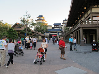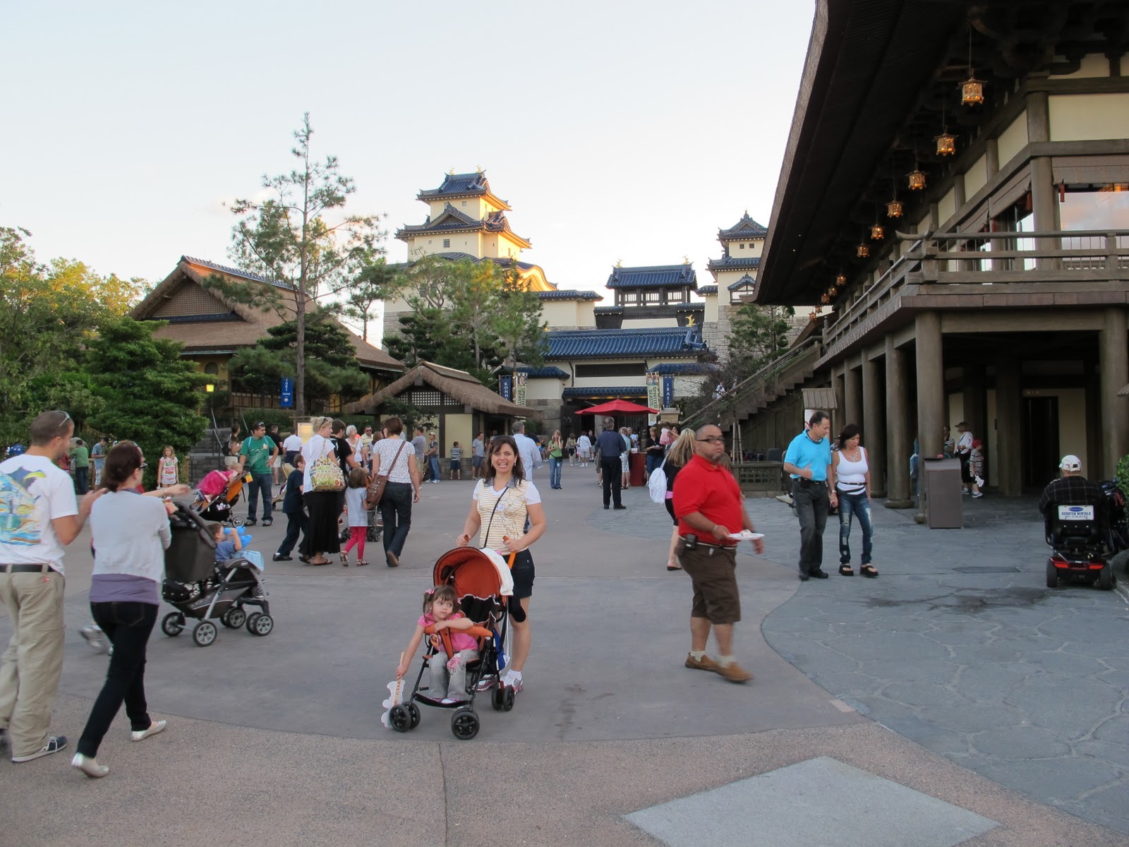 Fomos até lá, e ainda esperamos uma meia hora pelo show. Quando assisti pela primeira vez este show, achei fenomenal e nem um pouco cansativo. Mas hoje eu acho um pouco longo. Muito tempo atrás tinha uma parte inicial em que cada país era iluminado, um por um, e demorava um tempão. Eles tiraram esta parte, e ficou melhor. Mas ainda acho que as projeções no globo poderiam ter 1/3 do tempo. Eu gosto mesmo da parte dos fogos. Eu aaaamo os fogos! Quando terminam a gente fica com uma sensação de adrenalina, satisfação e felicidade, e é uma delícia. Eu fico me achando o máximo por estar ali. Depois do show a mãe quis voltar para o hotel, já que ela estava direto no parque, e ela concordou em levar a Ellerim junto. Oba! Eu e o Mauro poderíamos aproveitar o Soarin e o World Showcase nas horas mágicas! E foi ótimo também porque no dia seguinte a Mãe e a Rô iriam com as crianças para o Busch Gardens, e eu e o Mauro iríamos fazer um tour pelos hotéis da Disney. Mas a mãe não quis levar o carrinho junto, então ficamos nós dois carregando o carrinho vazio. Fomos direto para o Soarin, usar o fast pass que pegamos de manhã. O FastPass era para a metade da tarde, mas como eles não expiram, usamos sem nenhum problema. A fila, claro, ainda estava enorme, mas abriram novamente o FastPass de horas mágicas, e já pegamos mais um. Eu amo essa atração, acho uma sensação maravilhosa. Sobrevoar San Francisco, levantar os pés para não bater na copa das árvores e nas ondas do mar, sentir o cheiro das laranjas. Mas pegamos um lugar bem do lado, e na segunda fila. Não é tão legal quanto ficar no meio, mas mesmo assim foi uma delícia. Nós percebemos uma falha na tela, um risco, que antes não tinha. Saímos dali e fomos para os países, começando pelo Canadá. E fomos apenas curtindo e aproveitando, país por país. Na França paramos para comprar duas taças de Beaujolais Village, que é um dos vinhos mais baratos, por US$ 6 a taça. O parque estava lindo, e completamente vazio. Parecia até estar fechado.