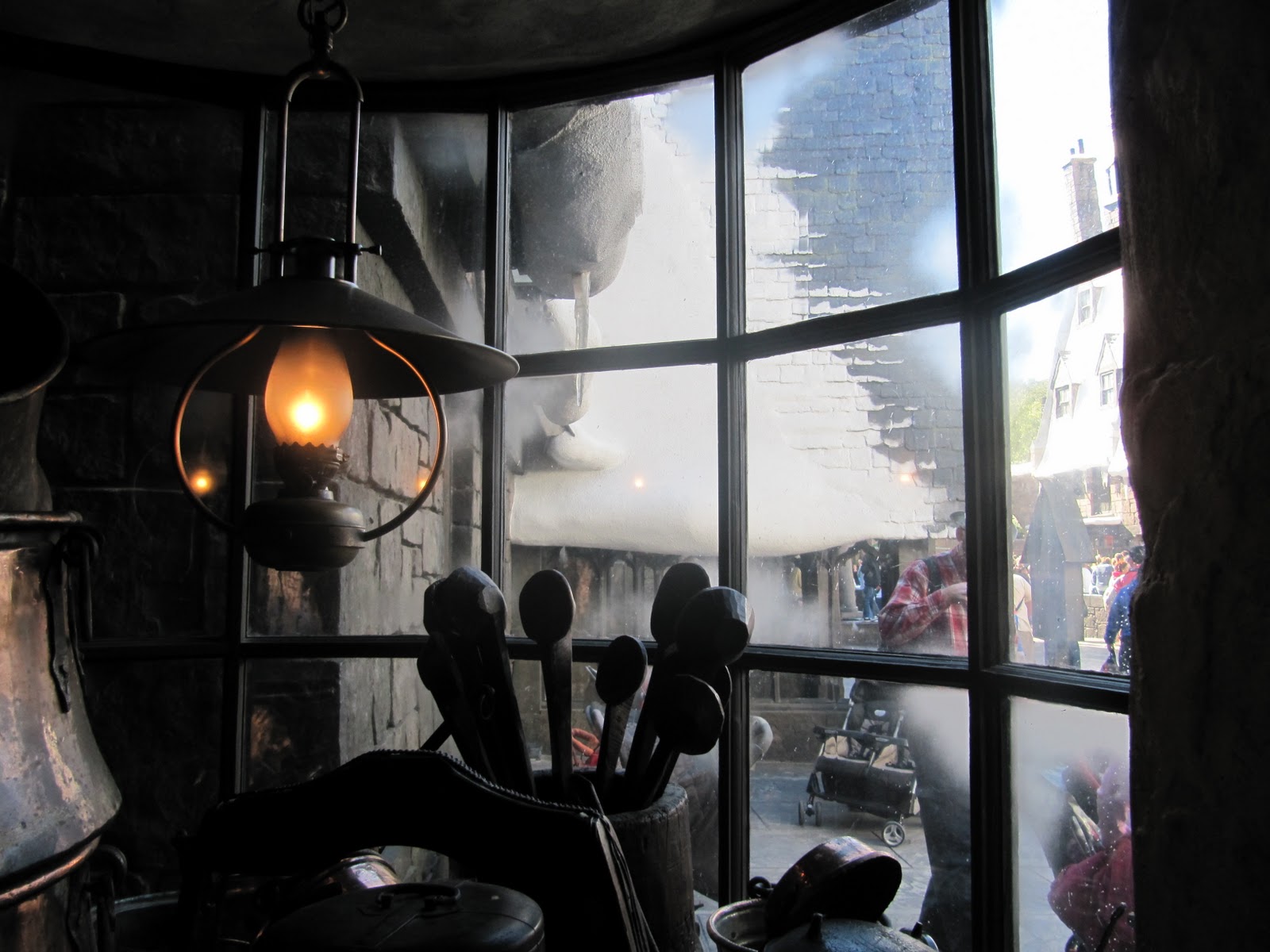 O Mauro ficou ali com a Ellerim, e eu fui passear um pouco por Hogsmeade (muito lindo tudo) e tirar algumas fotos. Antes de ir eu pensava em ficar uma ou duas horas em Hogsmeade sentada só apreciando o lugar, me sentido dentro do livro… o problema é que tem trouxas demais por lá, e não dá pra fazer isso. É muita gente. Mesmo assim, eu fiquei tentando apreciar um pouco. Tem algumas varinhas em exposição, um cartaz do Sirius que é impagável, perfeito, uma mandrágora, o traje de gala do Harry e o vestido que a Hermione usou no Baile do Torneio Tribruxo, a loja de caldeirões e de equipamentos mágicos, a entrada do Hog’s Head (Cabeça de Javali). Tudo muito legal. Só não sei por que eles não usaram vidros anti-reflexo, porque os vidros são péssimos para fotos.