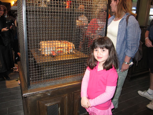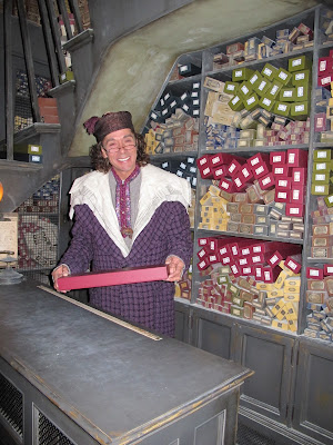 Nisso a mãe me chama toda apavorada no Walk Talk, pra eu ir correndo pra frente da Ollivanders. Cheguei ali toda esbaforida pra ver o que ela queria e ela mandou eu ficar na frente delas na fila, porque elas eram as próximas a entrar na Ollivanders. Ããã? Eu disse que não né (chato mãe, todo mundo aí na fila) e ela disse que ia me matar se eu não entrasse, porque ela tava uma hora parada na fila daquela besteira só pra eu poder ir (?!?!?! Eu juro que não pedi, já tinha decidido que não valia a pena)… bom, acabei entrando, e nem consegui avisar o Mauro. A loja é fenomenal (acho que a gente devia poder entrar ali sem precisar assistir o show, que é engraçadinho, mas não vale uma hora de fila).