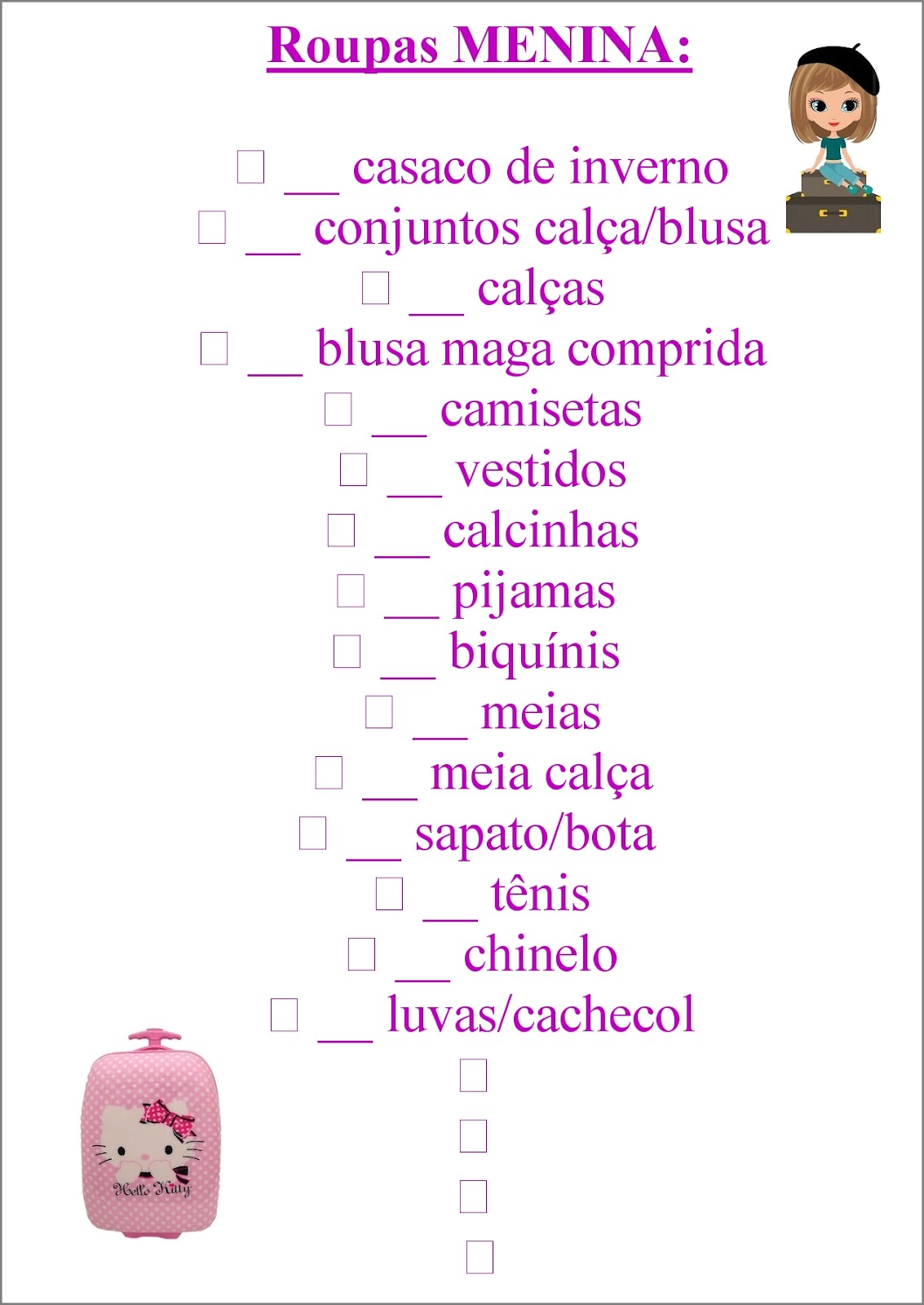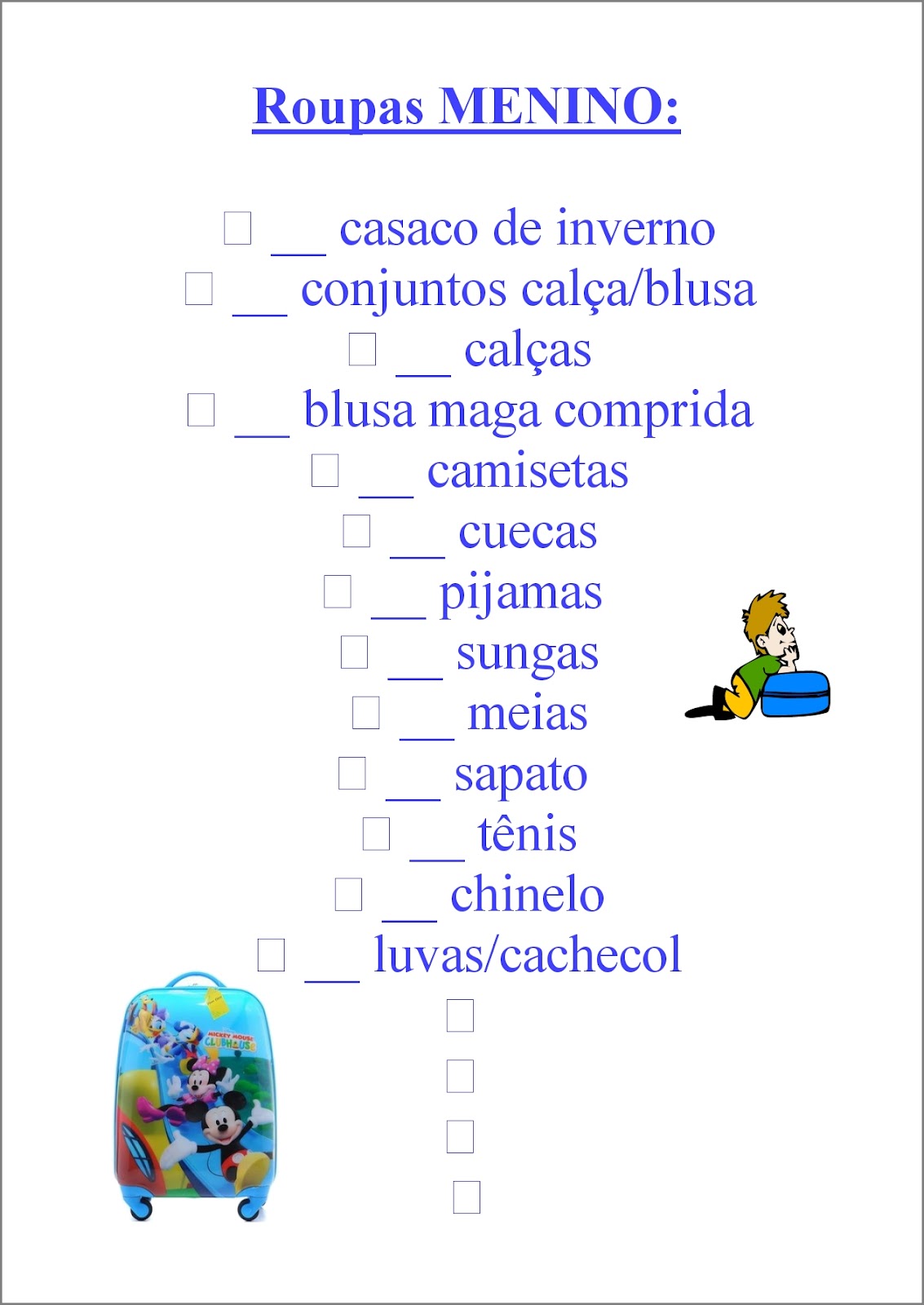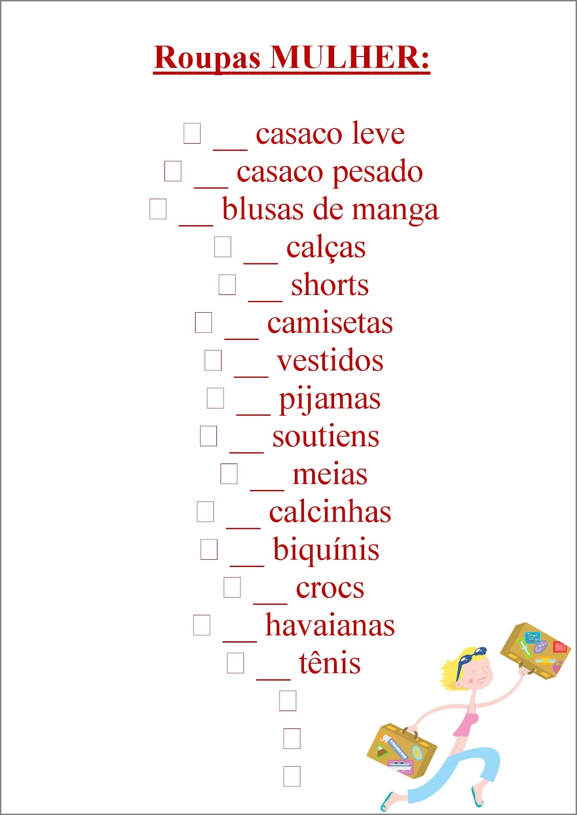 Anote à caneta o número de peças de acordo com o lugar, clima e tempo de viagem: