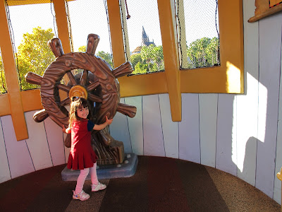 Depois a gente se separou de novo, porque a Rô foi pegar a fila do Pteranodon Flyers, que tava em 40 minutos (nem pensar…). e nós fomos rir da desgraça alheia do pessoal se ensopando no Jurassic Park River Adventure. Ficamos um tempão só passeando e tirando fotos, nós três. Fomos também no Barco do Popeye (dei um descanso pro Mauro, e fiquei brincando ali com a Ellerim). Aliás, esse é um lugar excelente para tirar fotos do parque. De cima do barco temos uma vista muito linda de todo o parque, fotos perfeitas.