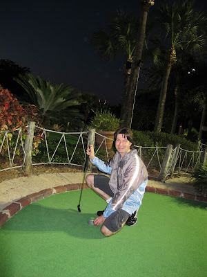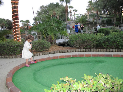Eu fiquei feliz em poder fazer um programa diferente, porque quase nunca conseguimos tempo pra isso. Antigamente, com meu pai, sempre fazíamos esses passeios. Mas com os anos o número de parques em Orlando foi aumentando tanto que nunca sobra tempo. E foi uma grata surpresa. O local é muito lindo. O preço normal é $ 10,95 adulto e $ 9,95 criança para o circuito de 19 buracos, e $5 a mais para o circuito de 36. Depois de pagar (usando nosso cupom de $ 1 de desconto por pessoa), o rapaz me deu duas bolas, dois bloquinhos e dois lápis. A Ellerim ganhou uma bandeira e um tapa-olho de pirata. Tá… e agora? Eu perguntei o que eu devia fazer, e ele disse “‘isso aqui é um mini golfe!” tá, isso eu sei, mas como funciona? E o cara ficou me olhando como se eu fosse retardada, e disse “você joga!”… bom, depois dessa fomos descobrir sozinhos então né…. Funciona assim. Paga-se por pessoa que joga, e cada um ganha um taco e uma bola para passar por um circuito de buracos, que deve ser percorrido em ordem. Pegamos um taco pra Ellerim e um pro Mauro, e a Ellerim ficou eufórica. Nossa, ela realmente entrou no clima. A gente vai seguindo um por um os buracos, que vão ficando cada vez mais difíceis. Em alguns deles a bola cai no buraco e sai em outro campo, que tem outro buraco. Era uma diversão ver a Ellerim jogando, empurrando a bolinha com o taco até a boca do curaco, e correndo de buraco em buraco.