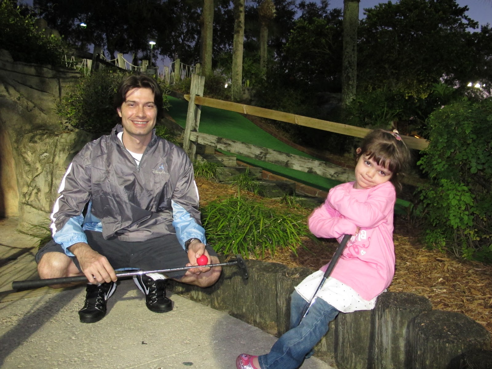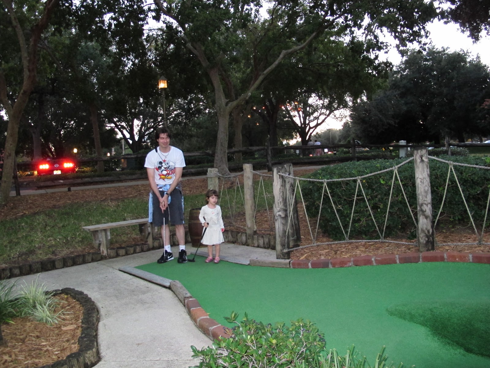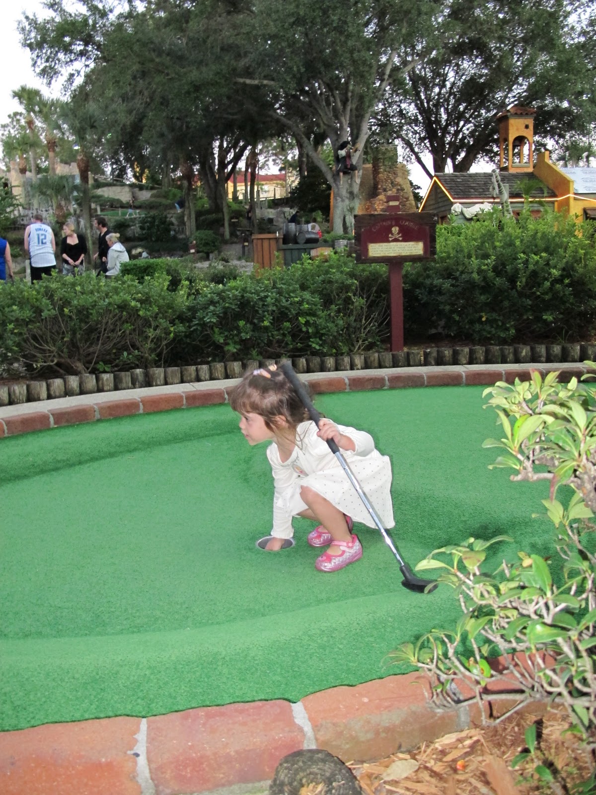Eu fiquei feliz em poder fazer um programa diferente, porque quase nunca conseguimos tempo pra isso. Antigamente, com meu pai, sempre fazíamos esses passeios. Mas com os anos o número de parques em Orlando foi aumentando tanto que nunca sobra tempo. E foi uma grata surpresa. O local é muito lindo. O preço normal é $ 10,95 adulto e $ 9,95 criança para o circuito de 19 buracos, e $5 a mais para o circuito de 36. Depois de pagar (usando nosso cupom de $ 1 de desconto por pessoa), o rapaz me deu duas bolas, dois bloquinhos e dois lápis. A Ellerim ganhou uma bandeira e um tapa-olho de pirata. Tá… e agora? Eu perguntei o que eu devia fazer, e ele disse “‘isso aqui é um mini golfe!” tá, isso eu sei, mas como funciona? E o cara ficou me olhando como se eu fosse retardada, e disse “você joga!”… bom, depois dessa fomos descobrir sozinhos então né…. Funciona assim. Paga-se por pessoa que joga, e cada um ganha um taco e uma bola para passar por um circuito de buracos, que deve ser percorrido em ordem. Pegamos um taco pra Ellerim e um pro Mauro, e a Ellerim ficou eufórica. Nossa, ela realmente entrou no clima. A gente vai seguindo um por um os buracos, que vão ficando cada vez mais difíceis. Em alguns deles a bola cai no buraco e sai em outro campo, que tem outro buraco. Era uma diversão ver a Ellerim jogando, empurrando a bolinha com o taco até a boca do curaco, e correndo de buraco em buraco.