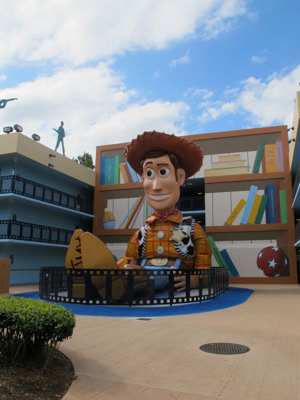 Dali fomos para o quarto do Andy. Tem um playgrownd no caminho, e antes da porta de entrada já vemos aquele carrinho de corrida de controle remoto, que dá para as crianças entrarem. Bom, esta parte eu achei fenomenal! Deu vontade de ficar no All-Star só para ficar ali, na parte do Toy Story, com o Woody e o Buzz gigantes. É realmente linda essa área.