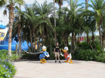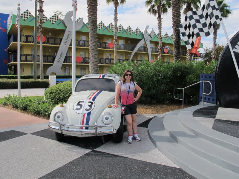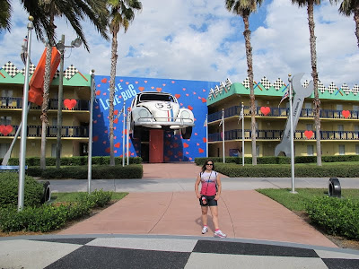 Visitamos já o Lobby e o restaurante. Minha primeira impressão é que o Pop é bem mais alegre, mais claro e mais colorido. Além disso, a lojinha do Pop é bem mais legal, porque fica entre o Lobby e o restaurante, enquanto a do All-Star fica do lado, numa sala fechada. E o All-Star tem uma baia a menos no restaurante. Saímos para a piscina, que é muito linda, mas a pintura parecia meio desbotada. Conhecemos a parte do Fantasia. Não sei, não gostei muito daquele palhaço gigante, achei meio assustador. Já a parte do Herbie é bem legal, com uma área molhada. Essa área fica bem longe do Lobby.