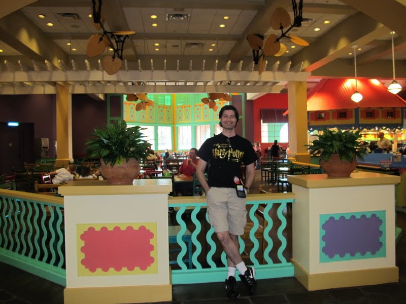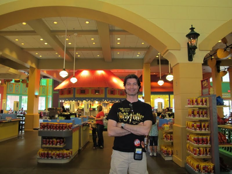 Fomo de carro porque o hotel é gigantesco, e as áreas ficam tão longe umas das outras que precisamos ir de carro ou de ônibus (cada área tem seu ponto de ônibus). Quando chegamos no restaurante eu fiquei encantada. Parecia uma cidadezinha mexicana, cheia de barraquinhas. A tematização é lida. E a lojinha fica junto, e é muito bonitinha também. A comida é ótima, e tem bastante opção. Muito melhor que os restaurantes Quick Service dos hotéis luxuosos, e mais legal do que os econômicos também. Aproveitamos para almoçar, pois já era perto das três da tarde. Comemos uns sanduiches em baguetes, e de sobremesa tomamos sorvete, tudo do Dining Plan.