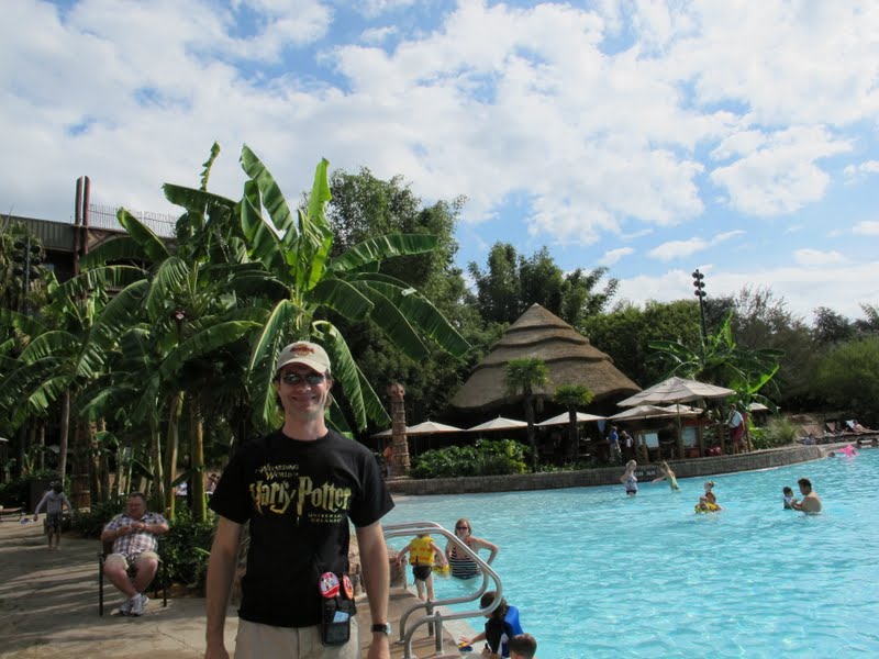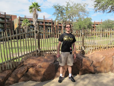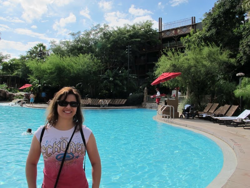 Começamos a andar pelo caminho que parecia no mapa, mas acabamos num corredor de quartos (e vimos um quarto por dentro, legal, mas nada de extraordinário). Perguntei então para uma camareira, que foi muito simpática. Pelo jeito estávamos no lugar certo, mas no andar errado, e ela apontou para o final do corredor e mandou a gente ir para o “fóst floor”. Bom, eu disse pro Mauro pra gente entrar no elevador e procurar nos andares algo parecido com “fóst”, que devia ser alguma coisa em algum andar… mas dentro do elevador não tinha nada escrito… perguntei pra outra camareira que apareceu, e então entendi que “fóst” era na verdade “first”. Bom, daí foi fácil, descemos para o primeiro andar e já chegamos na piscina, e o restaurante era bem na frente. Os restaurantes Quick Service dos hotéis chiques são bem simples na verdade. Como os hotéis econômicos só tem um restaurante Self/Quick Service, o restaurante é sempre bem legal, com várias opções. Mas os hotéis luxuosos tem dois ou três restaurantes Table Service, então os Quick Serice são pequenos, só com uma lanchonete, bem mais simples que os dos hotéis econômicos. Como já passava das dez e meia, pegamos um café quase almoço com nosso dining plan. Escolhemos aqueles cafés completos, que vem um pão de batata, hamburger, salsicha, bacon, batata assada, uma coisa enorme! É gostoso, mas é bem diferente para o nosso paladar, principalmente aquele hambúrguer, que eles chamam de sausage (arrrg). Pegamos café com nossas Mugs, e algumas manteigas e geleias, e fomos para o lado de fora, aproveitar para sentar perto da natureza (que tem de monte nesse hotel). Comemos com vários passarinhos ao redor, tentando pegar as migalhas de pão. O clima estava bem gostoso, e achamos que foi uma ótima ideia esse passeio. Um lugar muito bonito, e um pouco diferente do que eu imaginava. Eu pensava que ia ter um ar de floresta, como o parque, mas na verdade é muito mais uma savana, com pouca vegetação. É tudo bem marrom, cor de areia. Quando terminamos, uns 40 minutos depois, fomos até a piscina. É legal, mas não tem nada de extraordinário (as piscinas do Polynesian, Caribbean Beach, BoardWalk Inn e até dos econômicos são mais legais).
