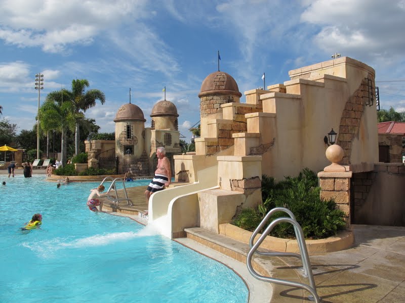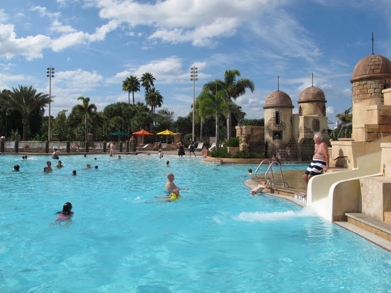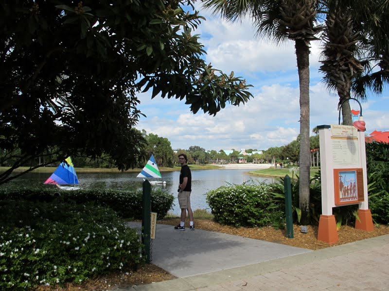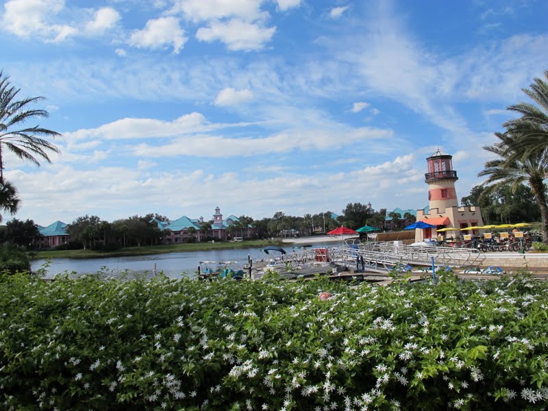 Mas sabe de uma coisa. Depois de visitar todos esses hotéis, nós concluímos que, com crianças pequenas, os hotéis econômicos são bem melhores que os moderados. Nesse hotel você fica tão longe de tudo que sempre precisa do carro ou de ônibus, e isso pode ser um problema com os pequenos. E o Lobby fica separado do restaurante! No econômico, a gente quer resolver alguma coisa no Lobby (quase todos os dias tem alguma coisa, alguma informação, ou reserva pra fazer, compras para pegar). Enquanto um fica no restaurante ou lojinha, o outro vai no Lobby, ou a criança fica vendo TV enquanto resolvemos as coisas. Já num hotel como o Caribbean, você não tem esta opção. Acho que o Lobby concentrado (Lobby, restaurante, banheiros, lojinha, fliperama, sala de TV, tudo na frente da piscina) faz com que a viagem fique bem mais simples. Principalmente quando estamos com crianças, ou quando chegamos cansados no hotel. Além disso, a tematização não é da Disney. Então, talvez valha a pena para casais ou adolescentes, principalmente por causa dos esportes aquáticos, mas eu continuo preferindo me hospedar nos econômicos. Bom, já os luxuosos são outra história… quem dera meu orçamento permitisse! Depois de passear bastante por toda piscina, fomos dar a volta completa de carro no hotel. É tudo muito bonito, e vale a pena conhecer.