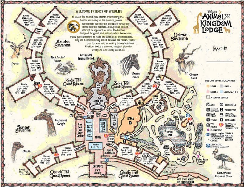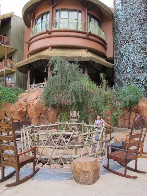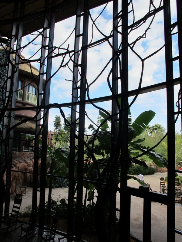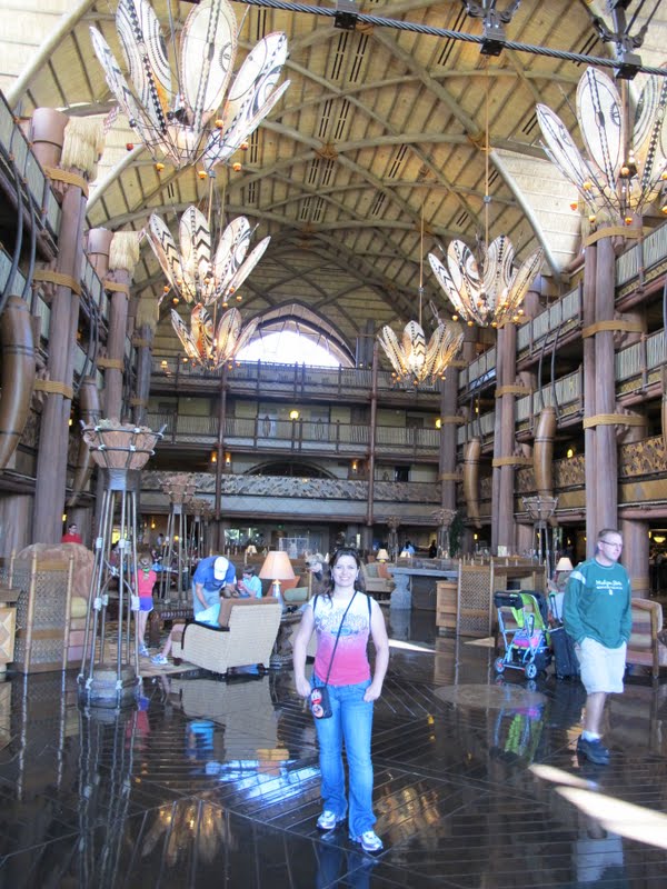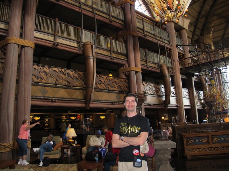 Bom, pegamos nossas Mugs, nosso carro e nosso mapa e saímos para descobrir. A gente tava sem GPS, porque emprestamos para a Rô, mas isso não é problema dentro das terras da Disney. Tudo é muito bem sinalizado. Mas eu achei bom passar na Concierge do Pop e pegar um mapa (eu trouxe alguns desses mapinhas, que de um lado tem o Mapa das terras da Disney e do outro um mapa de Orlando). Mesmo assim passamos reto na primeira vez, e acabamos num lugar só para funcionários. Mas demos a volta e logo chegamos. Como a gente tinha no painel aquela folhinha de estacionamento que eles dão para hóspedes, os guardas só abrem a cancela, sem perguntar nada. Entrando no estacionamento já vimos que tem dois caminhos, um para valet parking e outro para self parking, e só o segundo é gratuito, e fica bem mais longe da entrada. Quando chegamos na frente do hotel tinha uma fila enorme de carros e pessoas. Bom, prova de que, na Disney, até os ricos pegam filas! Daí que me dei conta de que era sábado, e parecia ser todo mundo americano (já anotei a dica: nunca fazer check in aos sábados). Já na entrada, no local onde os carros chegam, tem um mosaico africano enorme no chão. E dali pra diante tudo tem motivo africano. É bem impressionante. Já entramos no Lobby, e é ENORME. A decoração é exatamente como vemos nas fotos, tudo muito grande. E é muito lindo mesmo. Ouvi dizer que os imagineerings ficaram quase dois anos viajando para a África para fazer o parque e o hotel, e o resultado foi bem legal. Tem bastantes cast members africanos trabalhando lá, e são uma simpatia.