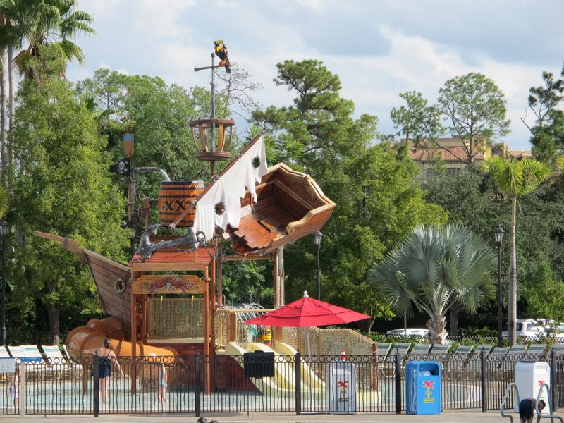 Saímos do restaurante direto para a piscina, e é maravilhosa. Acho que é uma das piscinas mais legais de todos os hotéis. Tem uma piscina grande com tobogã, e a piscina das crianças tem um navio pirata naufragado. Tudo isso de frente para o lago, com vários esportes aquáticos e lanchas para alugar. Essa parte do hotel é muito encantadora.