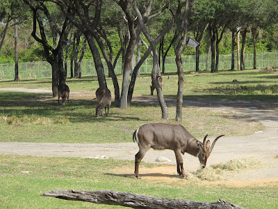 Todo o hotel tem vários observatórios para ver os animais, em todos os andares. A gente chega nesses observatórios pelos corredores dos quartos. Voltamos para o lobby, e fomos conhecer o outro lado do hotel, que tem um observatório grande, no meio da savana. Dali vimos gnus, antílopes e gazelas. Vários quartos possuem varandas para essa parte (imagino que estes são os quartos mais caros).