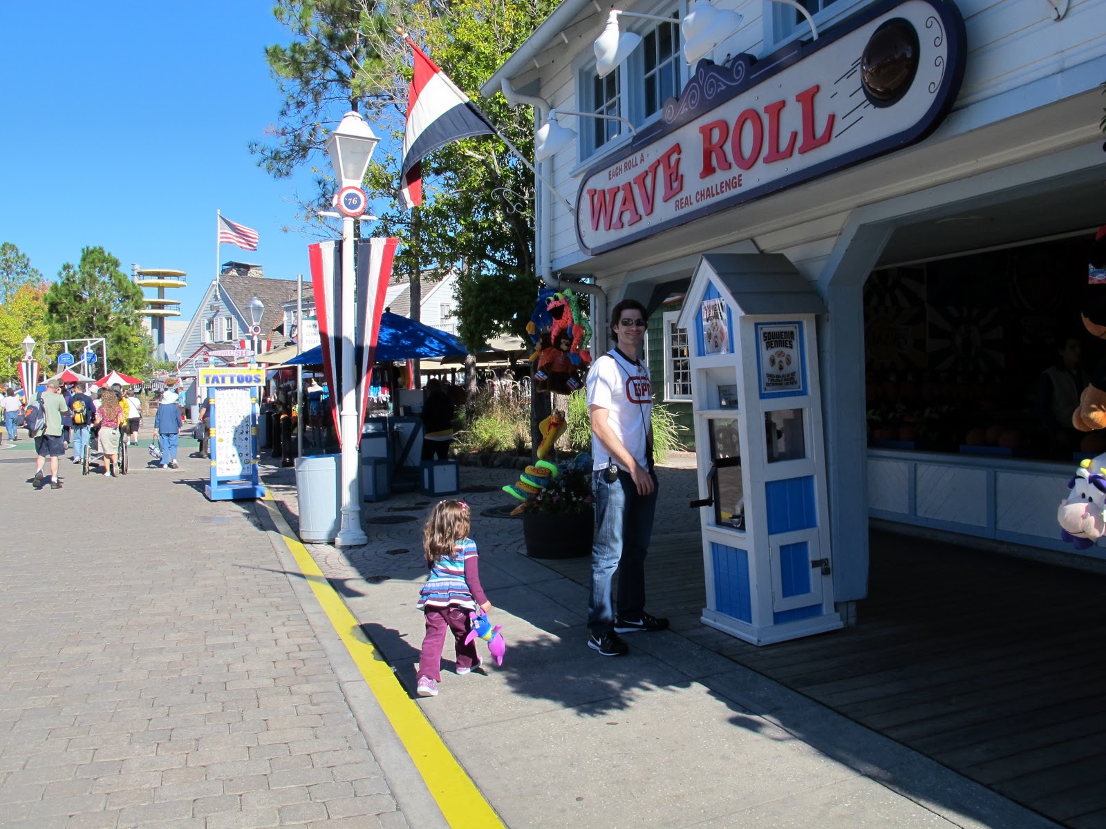 E pra melhorar, tinha uma pescaria do lado, que a Ellerim AMOU. Ela nem dá muita bola pro prêmio, ela quer mesmo é pescar (antes de ter filho eu nunca entendia essas coisinhas bobas nos parques, como pescaria e até o Dumbo… quem vai pagar pra ir na pescaria num parque com tanta coisa maravilhosa pra fazer?!?!?!?!?… bom, agora eu sei a resposta…). Almoçamos no Voyagers Smokehouse, e a comida era gostosa. Depois passeamos pelos pinguins (Penguin Encounter)… não sei qual é a minha história com pinguins, mas é uma paixão antiga. Eu fui nessa atração a primeira vez quando ela era novinha, e lembro que passei uma meia hora lá dentro naquele observatório atrás da esteira rolante, só observando.