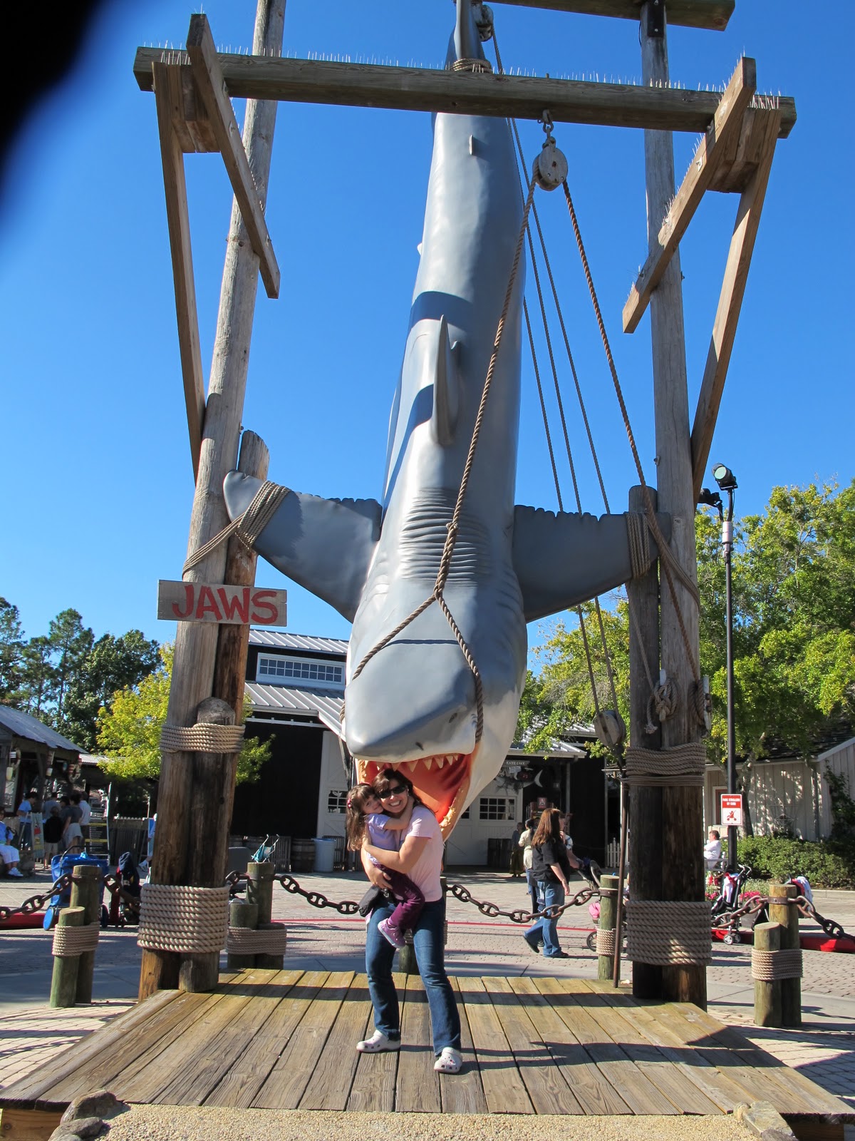 Depois a gente se separou de novo, porque a Rô foi pegar a fila do Pteranodon Flyers, que tava em 40 minutos (nem pensar…). e nós fomos rir da desgraça alheia do pessoal se ensopando no Jurassic Park River Adventure. Ficamos um tempão só passeando e tirando fotos, nós três. Fomos também no Barco do Popeye (dei um descanso pro Mauro, e fiquei brincando ali com a Ellerim). Aliás, esse é um lugar excelente para tirar fotos do parque. De cima do barco temos uma vista muito linda de todo o parque, fotos perfeitas.