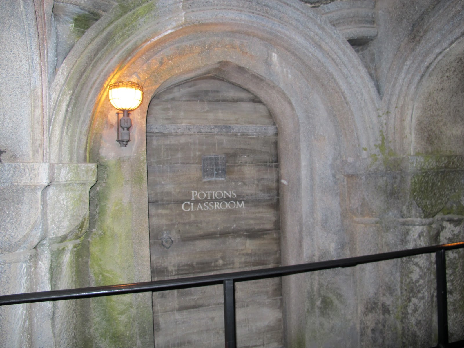 Eu queria chegar cedo para não correr o risco de ter muita fila, e chegamos às nove. Fomos direto para o Wizarding World of Harry Potter, e a fila estava em 20 minutos. A Ellerim já conhecia o castelo (afinal, tinha ficado com a mãe naquela fila uma hora e meia no outro dia…). Como fã, pra mim a fila faz parte da atração. Muito gostoso ir passando e identificando tudo. Começamos pelas masmorras, e passamos pelo espelho de Ojesed (Erised), a porta da sala de poções e a porta das cozinhas.