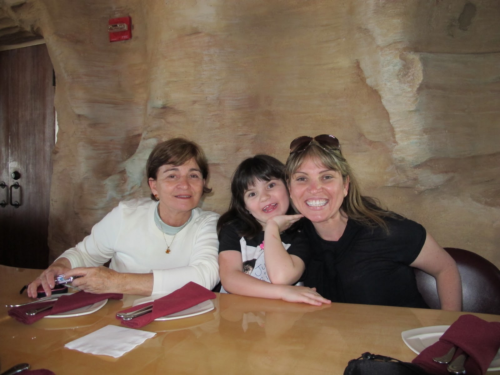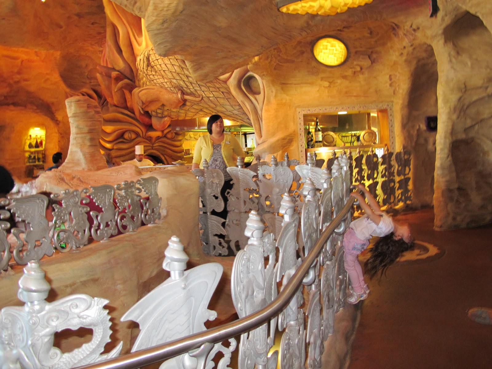 Saindo dali nós passamos na frente de um restaurante chamado Mythos, e tinha uma placa dizendo que era o ganhador do prêmio de melhor restaurante de parques do mundo por 6 anos consecutivos. Bom, achamos que valia a pena conferir. Mas a espera era de meia hora, e eu e o Mauro então fomos com as meninas para o parquinho do Dr. Seuss, e voltamos meia hora depois.