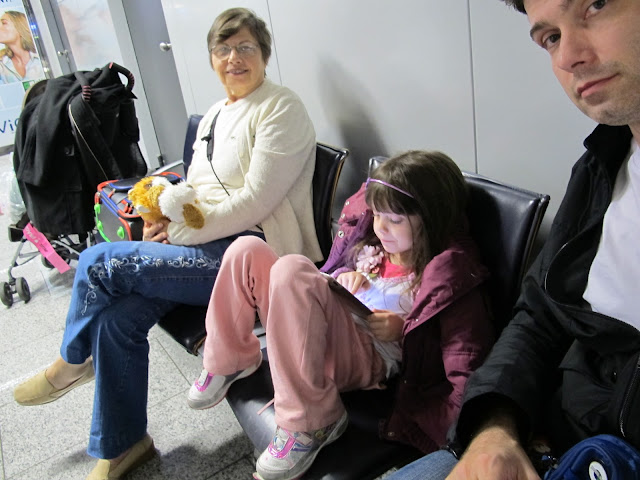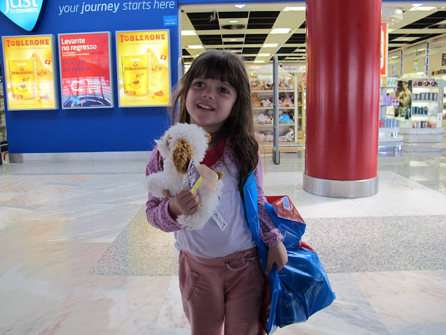 Aliás, a comida no aeroporto estava ótima, e com o dinheiro deu para comer bem, uns sanduíches lindos, uma salada deliciosa e pastéis de nata (pastéis de Belém). Foi um almoço bem gostoso. O Aeroporto é super legal, com muitas lojas e restaurantes, e uma praça de alimentação um pouco mais afastada que imita uma rua, e tem poltronas confortáveis para descansar. Mas já não sabia mais o que fazer para distrair a Ellerim. Ainda bem que tinha levado bastante coisinhas na mala de mão, e ainda compramos uns bichinhos no free shop.