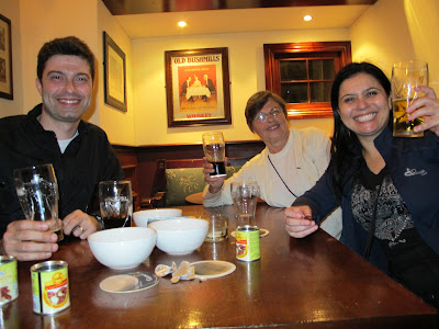Paramos então em um Pub Irlandês, e por pura pena o barman arranjou amendoins, Doritos e batata chips! Nossa, nunca comi com tanto gosto. Acompanhando, um chopp (amarrrrrgo).
